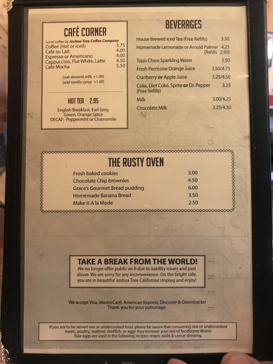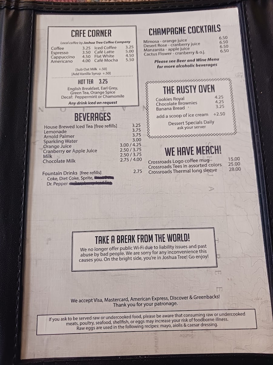Welcome to Crossroads Cafe - CA 92252, a charming diner nestled in the heart of Joshua Tree, where comfort food meets rustic charm. The menu tempts with mouthwatering options such as the Dessert Fried Egg Sandwich, a delightful blend of over-hard eggs and cheddar on grilled sourdough for just $6.00. For a more authentic flavor, try the Huevos Rancheros or indulge in the flavorful SoyRizo & Eggs, highlighting their vegan chorizo paired beautifully with fresh salsa.